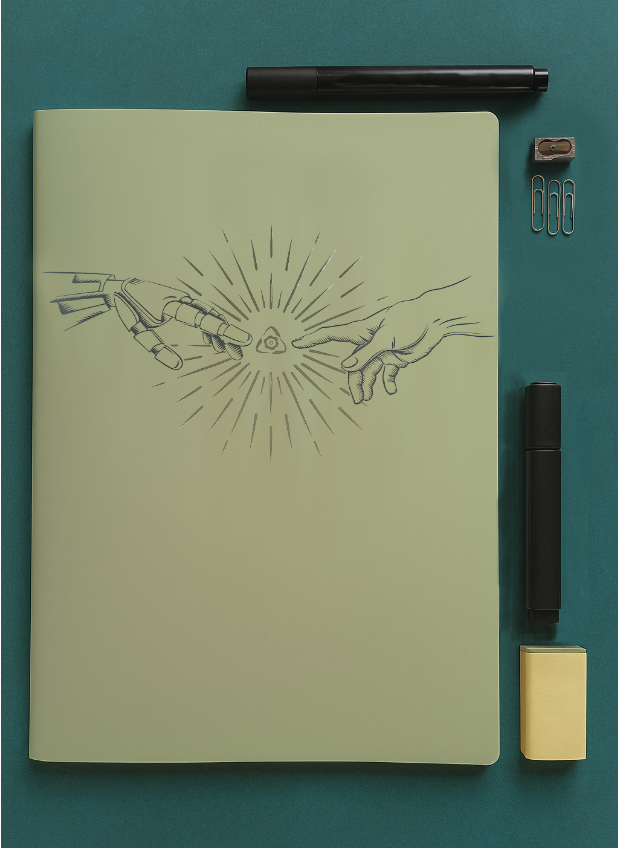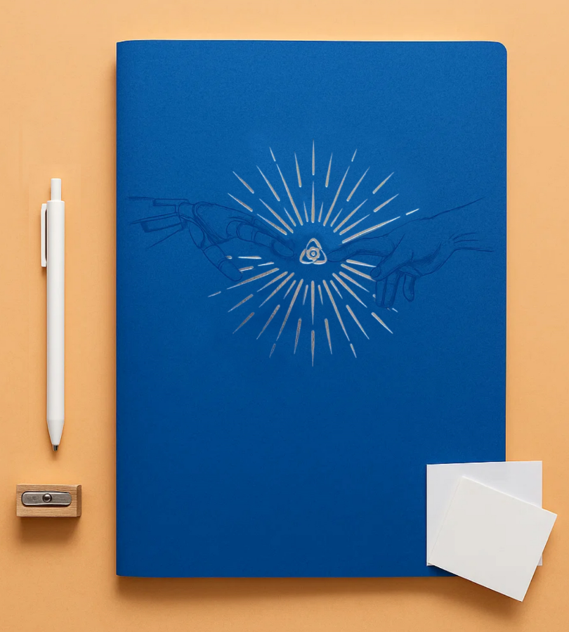 Скетчбук из дизайнерской бумаги с прошитым корешком и фольгированным тиснением на обложке. Листы внутреннего блока без печати, кремового цвета.